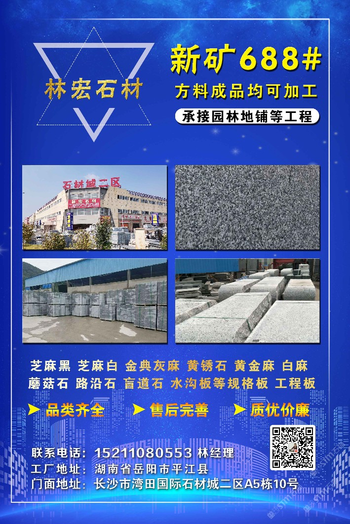 同等品質(zhì),價格更低-林宏石業(yè)林總152 1108 0553(微信同號)主營:新老礦芝麻黑654、芝麻灰655-688、芝麻白603、喬治亞灰641、黃金麻、黃銹石682、新礦福鼎黑、鐘山青、柬埔寨黑、長泰芝麻黑、廣西芝麻黑、山東芝麻黑、中灰麻、深灰麻等石材;湖南長沙長期配有大型堆場倉庫,廠礦一體,實力廠家;專注石材加工二十多年,工廠設(shè)備齊全,協(xié)作加工廠多,有實力承接大型工程;我們堅持“高效率、優(yōu)質(zhì)量、超低價”,專業(yè)石材批發(fā)、園林路沿、幕墻干掛、墓碑加工、水池水景工程;歡迎廣大客戶來電咨詢、洽談合作!