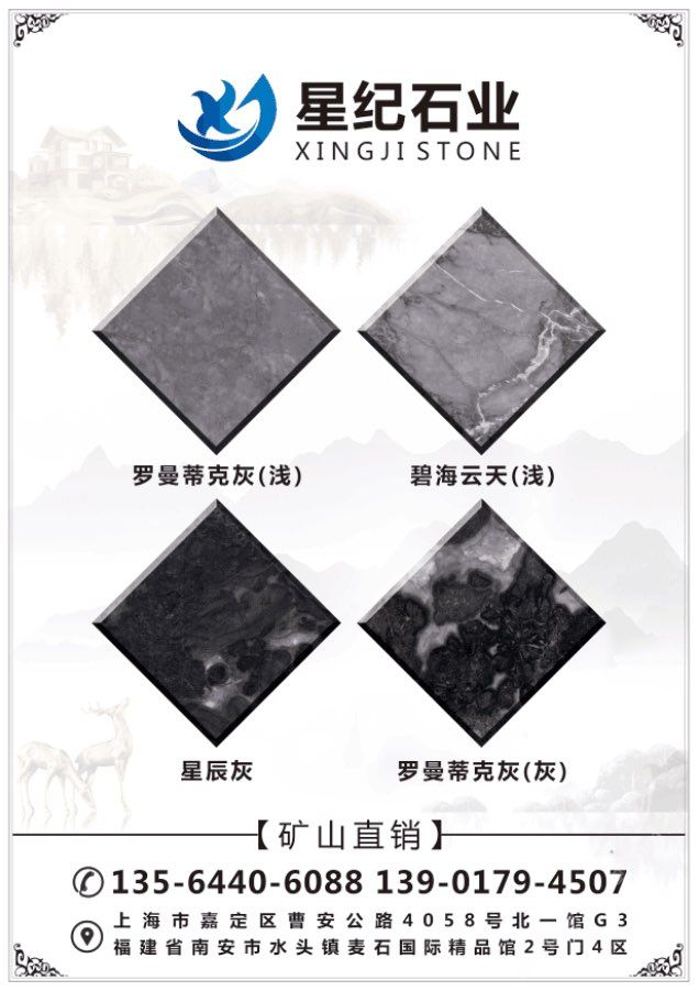 星紀石業(yè)專業(yè):龍馬礦星耀灰礦山直銷,底色一致,紋理清晰,適合各種工裝及家裝,常年備貨荒料5000噸,大板10萬方量大價優(yōu)。