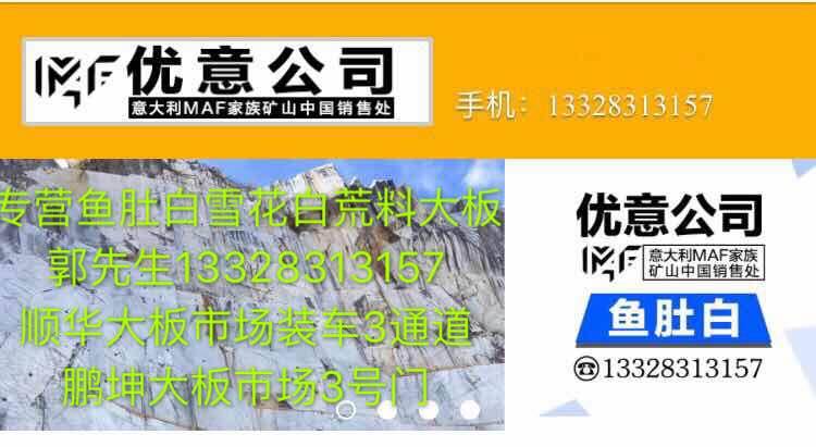 優(yōu)意公司是意大利MAF公司中國銷售處,2003年開始在中國銷售魚肚白、雪花白、大花白、卡拉拉白、卡金,卡拉卡塔,魚肚金荒料、大板、薄板,復合板,工程板、線條,馬賽克,異型加工、工藝品,承接工程成品單,合作電話:\