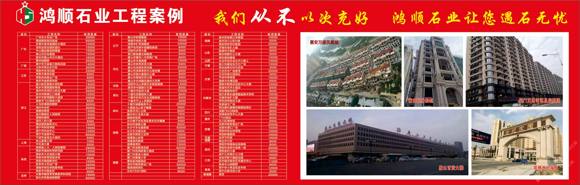 邁入新石代,踏上新征程,柬埔寨鴻順石業(yè)始終秉持著 20 多年來堅(jiān)守的“我們從不以次充好”這一品質(zhì)準(zhǔn)則,以及“鴻順精品讓您的品位高人一品”的經(jīng)營理念,嚴(yán)格遵循 28 道品質(zhì)控制流程,層層篩選,精心甄別,力保每一款產(chǎn)品都能讓客戶放心購買、安心使用。柬埔寨鴻順石業(yè)全體員工也將始終如一地為千萬家庭供應(yīng)優(yōu)質(zhì)的天然石品,使家更顯溫馨,讓城市愈發(fā)美麗!