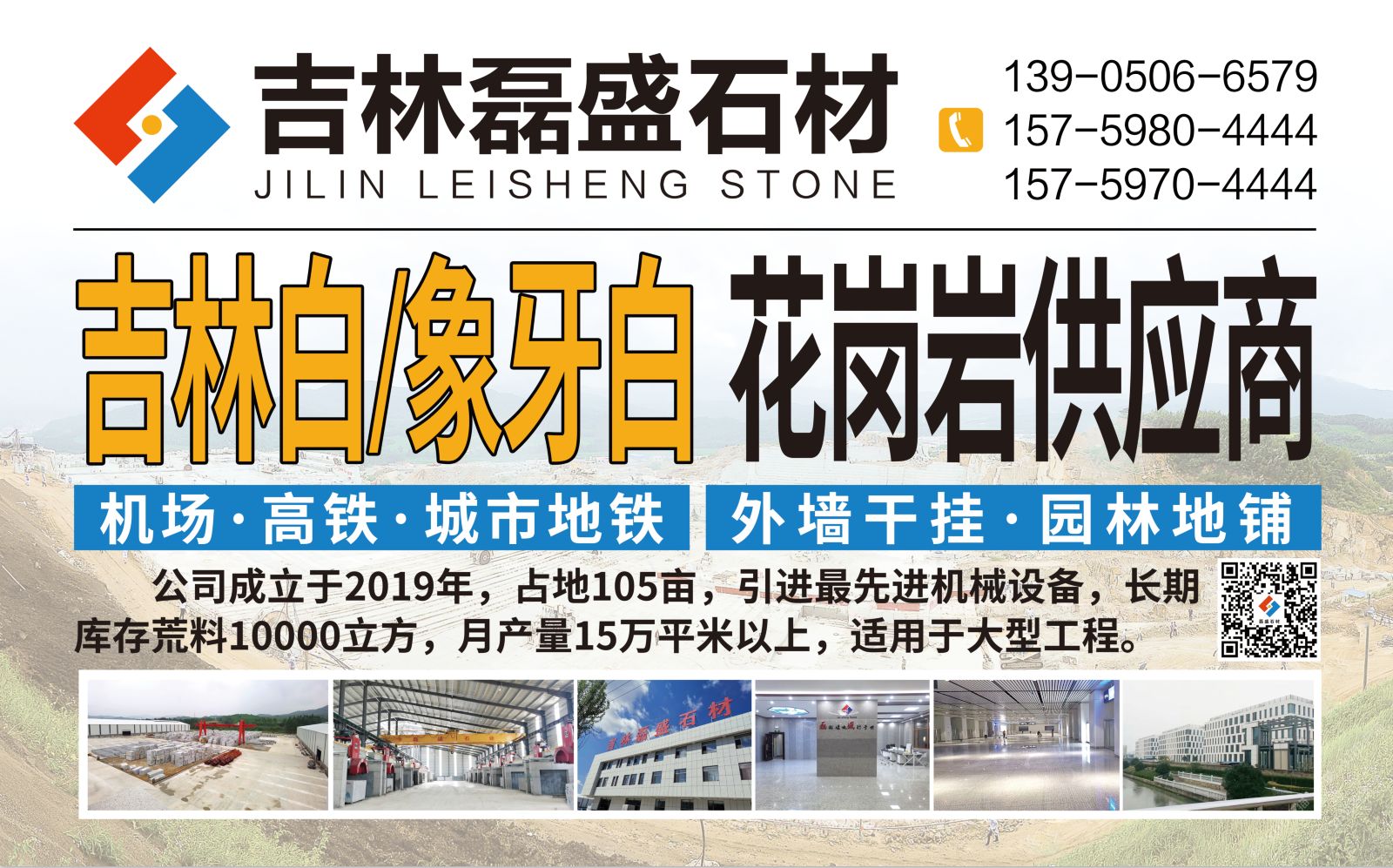 吉林磊盛石材有限公司成立于2019年占地105畝,引進(jìn)進(jìn)機(jī)械設(shè)備,月產(chǎn)吉林白(象牙白)20萬(wàn)平方。長(zhǎng)期庫(kù)存荒料10000立方 ,適用工程:(機(jī)場(chǎng),高鐵,城市地鐵,外墻干掛,園林地鋪)