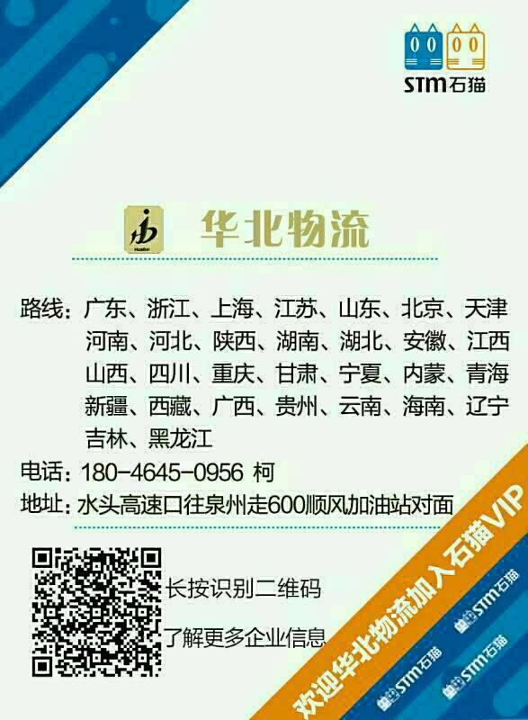 發(fā)布信息: 福建華北物流?貨運站: 承接福建--全國各地貨運,整車,零擔,我們的專線浙江,海南、合肥、北京、重慶、廣西、貴州、武漢、鄭州、江蘇、山東、上海、西安、廣東、成都、天津、云南、杭州、河北、長沙、東北三省整車零擔歡迎來電洽談!謝謝!真誠合作、共創(chuàng)雙贏 18046450956微信15905961654微信13115957597微信小柯