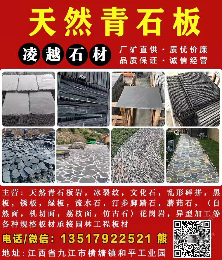 發(fā)布信息: 主營,冰裂紋,文化石,亂形碎拼,黑板,銹板,綠板,流水石,汀步腳踏石,蘑菇石,(自然面,機切面,荔枝面,仿古石)花崗巖 異型加工等各種規(guī)格板材承接園林工程板材。歡迎新老客戶的支持。購電話13517922521(微信同號)