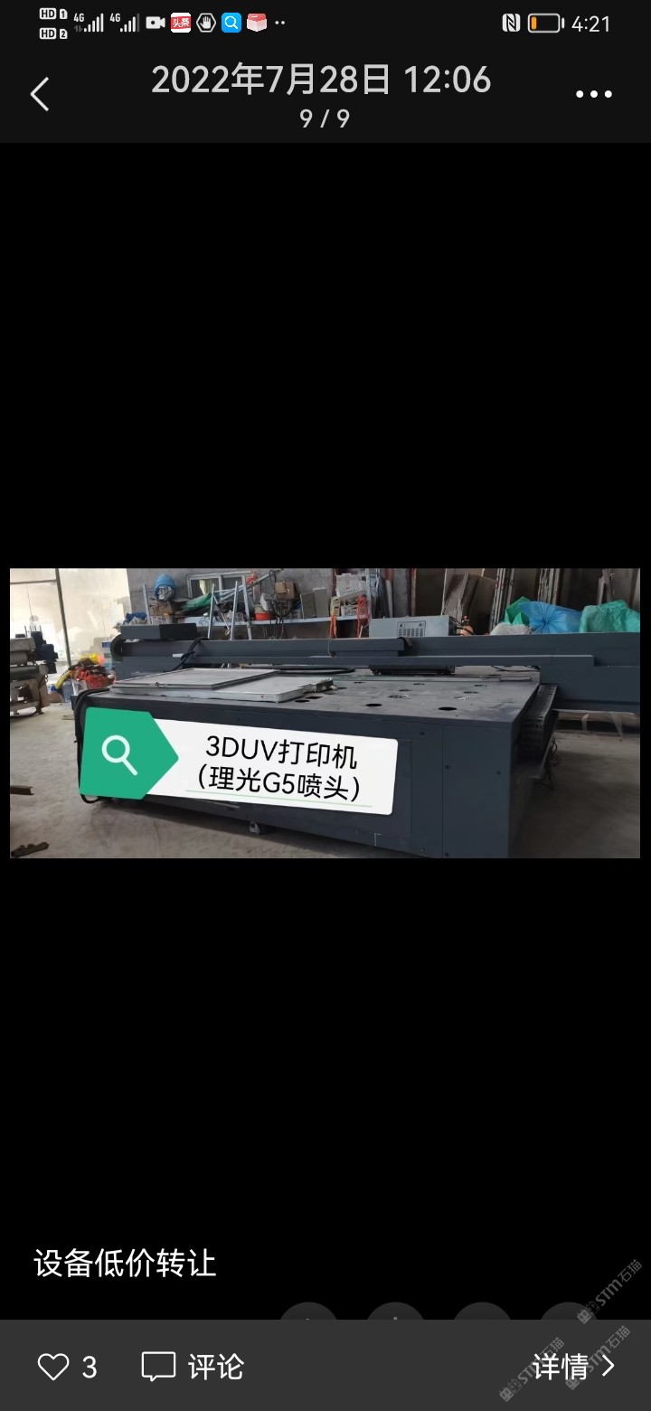 發(fā)布信息: 大理石過渡架15臺,180度翻板機(jī),五燈固化機(jī),雙滾滾涂機(jī),單燈固化機(jī),22千瓦除塵柜,3dUV打印機(jī)
