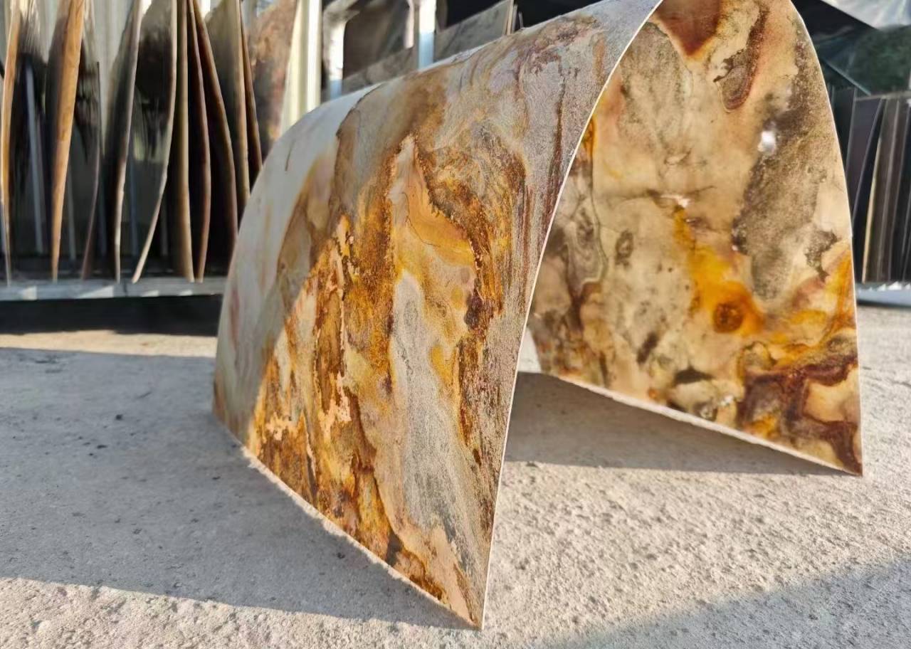 描述:是將天然大理石切割為0.8-1.2mm厚度,實現(xiàn)大理石復(fù)合后的超輕超薄可彎曲效果。改變了石材的物理性能,達(dá)到可以彎曲造型的效果,可以更大化實現(xiàn)設(shè)計師的設(shè)計想法,表面啞光工藝處理、圖案蝕刻處理、曲面弧面處理等均可實現(xiàn)。